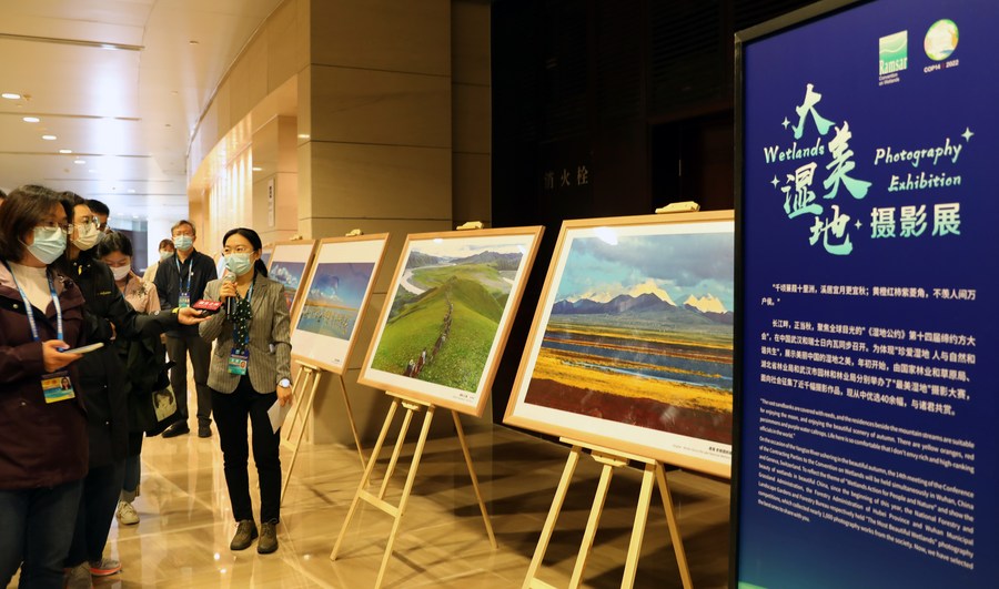 Participants view the exhibition on China's progress in wetland protection and restoration at the 14th Meeting of the Conference of the Contracting Parties to the Ramsar Convention on Wetlands (COP14) in Geneva, Switzerland, Nov. 5, 2022. (Xinhua/Lian Yi)