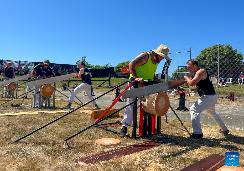 People take part in a wood-cutting competition during the Canterbury Agricultural Show in Christchurch, New Zealand, Nov. 9, 2022. One of the oldest expos in New Zealand, the Canterbury Agricultural Show, threw its gates open to the public on Wednesday in the New Zealand's Christchurch. (Photo by Walter/Xinhua)