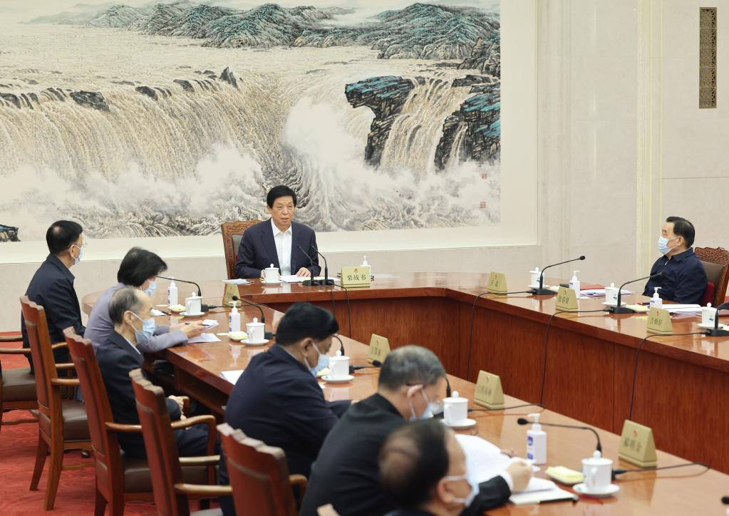 Li Zhanshu, chairman of the National People's Congress (NPC) Standing Committee, presides over the 129th meeting of the Council of Chairpersons of the 13th NPC Standing Committee at the Great Hall of the People in Beijing, capital of China, Nov. 9, 2022. (Xinhua/Wang Ye)