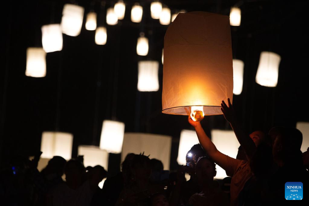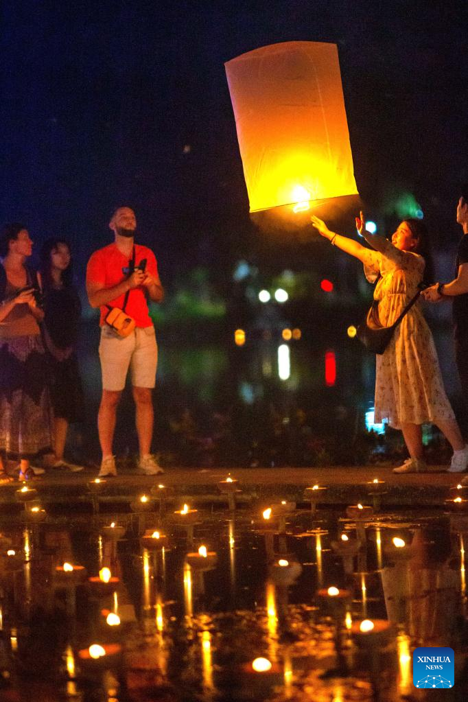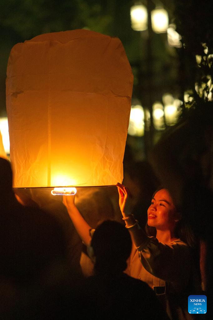 People release a sky lantern to make a wish for good fortune in Chiang Mai, Thailand, on Nov. 8, 2022. (Xinhua/Wang Teng)