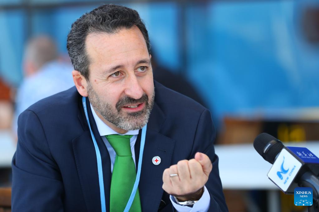 Robert Mardini, director-general of the International Committee of Red Cross, is interviewed with Xinhua during the 27th session of the Conference of the Parties (COP27) to the United Nations Framework Convention on Climate Change in Sharm El-Sheikh, Egypt, on Nov. 8, 2022. Countries enduring conflicts are highly vulnerable to climate risks due to their limited adaptive capacity, said Mardini in a recent interview with Xinhua. (Xinhua/Sui Xiankai)