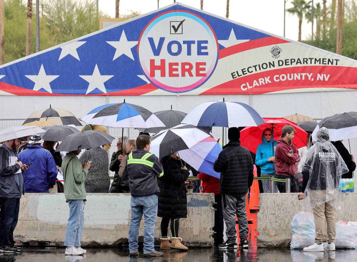 People line up in the rain to vote at a tent in a shopping center parking lot on Nov 8, 2022 in Las Vegas, Nevada. [Photo/Agencies]