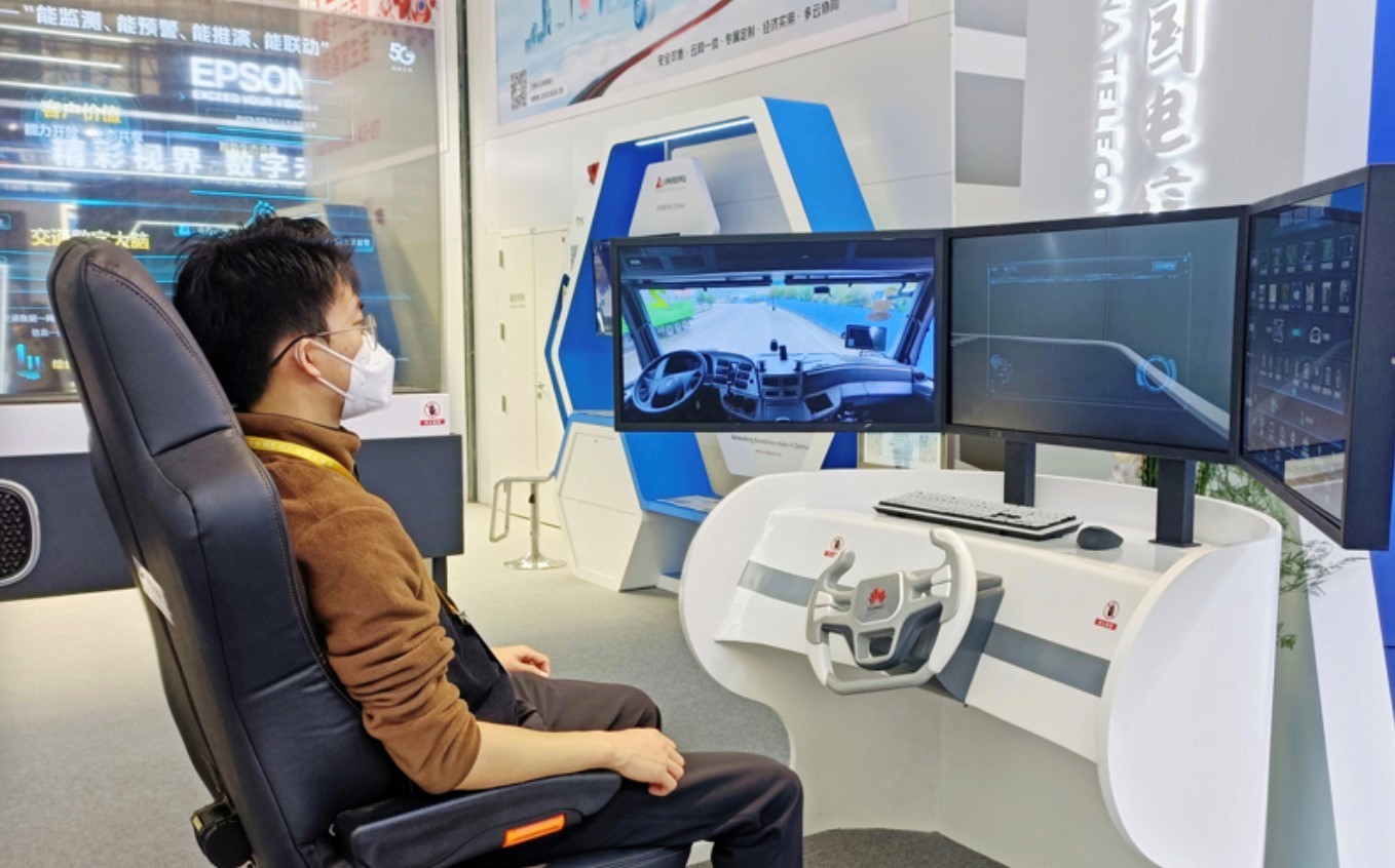 A visitor experiences a driverless vehicle at the booth of China Telecom at the Light of Internet Expo, part of the World Internet Conference (WIC) Wuzhen Summit in Wuzhen, east China’s Zhejiang Province, Nov.8, 2022. The Light of Internet Expo opened on Nov. 8, 2022, a day before the opening ceremony of the WIC Wuzhen Summit. (People’s Daily Online/Liu Xinwei)