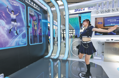 A woman exercises with an on-screen digital figure at China Mobile's exhibition booth. WANG JING/CHINA DAILY