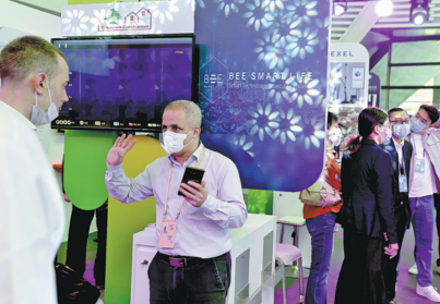 An employee of Huawei introduces products to a visitor at the company's booth during the conference. WANG JING/CHINA DAILY