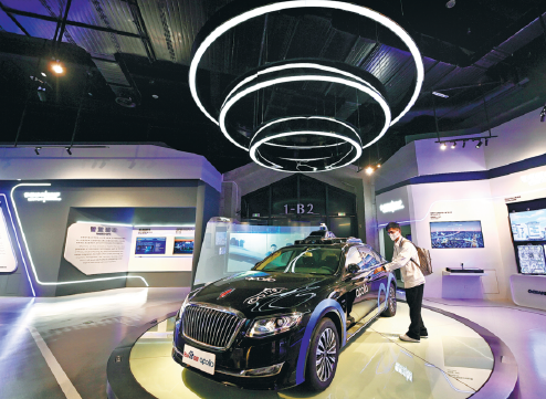 A visitor checks out a car equipped with Baidu's Apollo Go autonomous driving technology during the conference. WEI XIAOHAO/CHINA DAILY