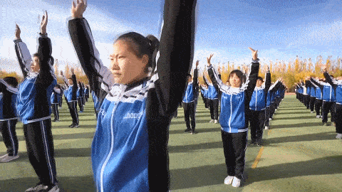 This GIF image shows students in school uniforms doing the "Dunhuang dance," a genre of classical dance, in the playground of a high school in Dunhuang city, northwest China's Gansu Province. (Photo courtesy of the Publicity Department of the Communist Party of China Dunhuang Municipal Committee)