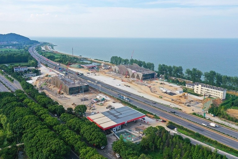 A rest area along the G25 Changchun-Shenzhen Expressway is being constructed in Changxing county, Huzhou, east China's Zhejiang province, June 2022. (People's Daily Online/Chen Haiwei)