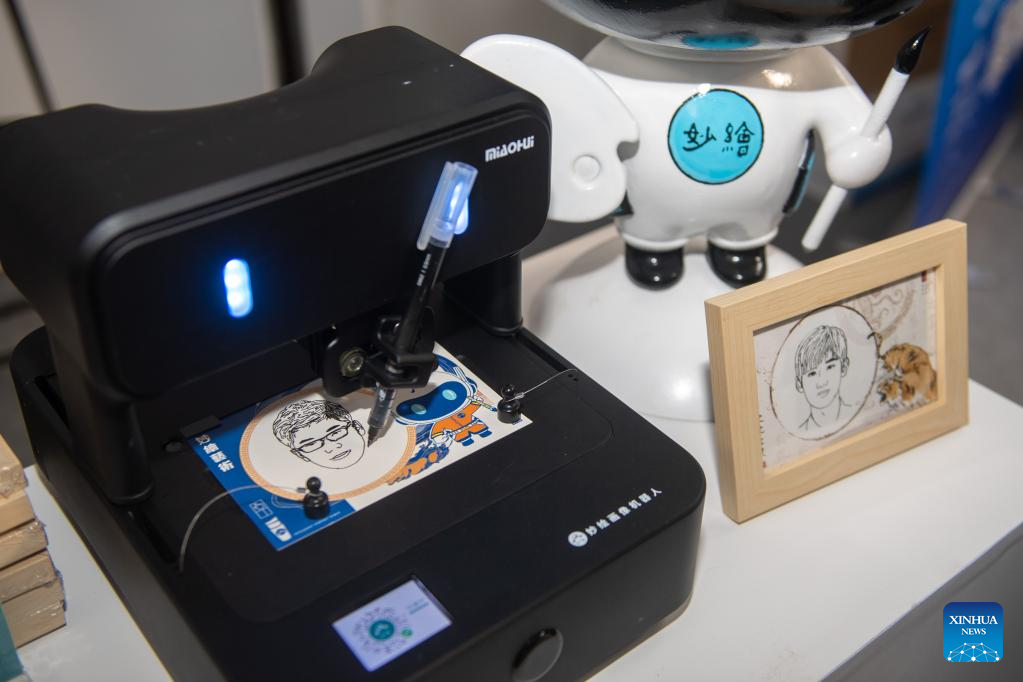 A Miaohui smart robot draws a picture at the Light of Internet Expo in Wuzhen, east China's Zhejiang Province, Nov. 10, 2022. (Xinhua/Jiang Han)