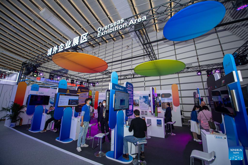 This photo taken on Nov. 10, 2022 shows the overseas exhibition area at the Light of Internet Expo in Wuzhen, east China's Zhejiang Province. (Xinhua/Jiang Han)