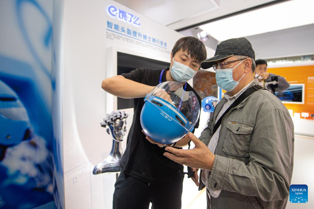 A staff member explains the working mechanism of a smart helmet to a visitor at the booth of Alibaba during the Light of Internet Expo in Wuzhen, east China's Zhejiang Province, Nov. 10, 2022. (Xinhua/Jiang Han)