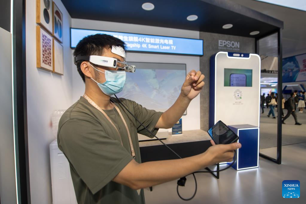 A visitor experiences a pair of AR glasses at the booth of Epson during the Light of Internet Expo in Wuzhen, east China's Zhejiang Province, Nov. 10, 2022. (Xinhua/Jiang Han)