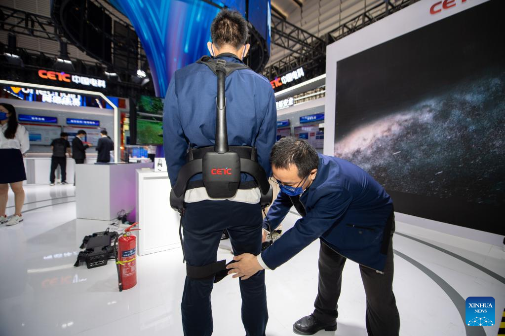 A staff member of the China Electronic Technology Group Corporation (CETC) helps a visitor wear an exoskeleton robot during the Light of Internet Expo in Wuzhen, east China's Zhejiang Province, Nov. 10, 2022. (Xinhua/Jiang Han)