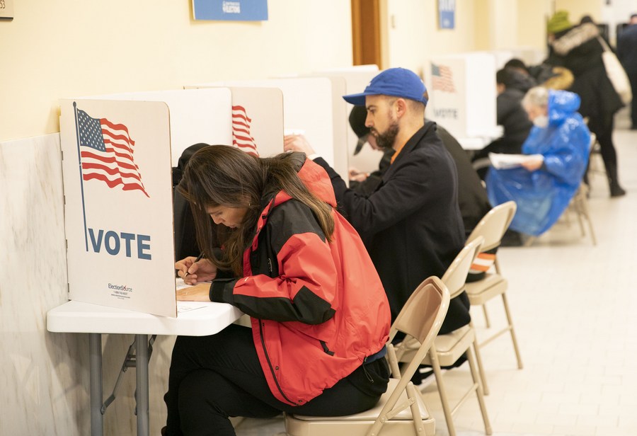 People are seen at a polling station in San Francisco, California, the United States, on Nov. 8, 2022. (Photo by Li Jianguo/Xinhua)