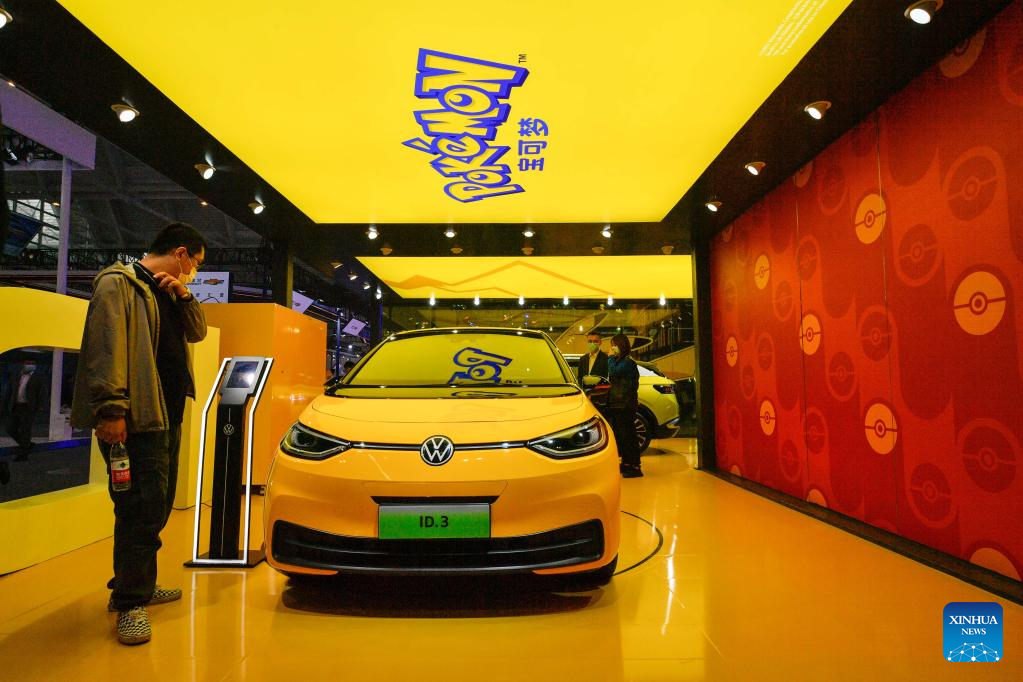 Visitors view an electric vehicle at the booth of German automaker Volkswagen during the China Motor Show (Tianjin) 2022 in north China's Tianjin, Nov. 10, 2022. (Xinhua/Sun Fanyue)