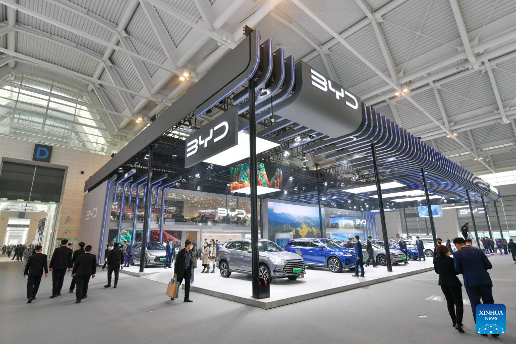 People visit the booth of Chinese carmaker BYD during the China Motor Show (Tianjin) 2022 in north China's Tianjin, Nov. 10, 2022. (Xinhua/Sun Fanyue)