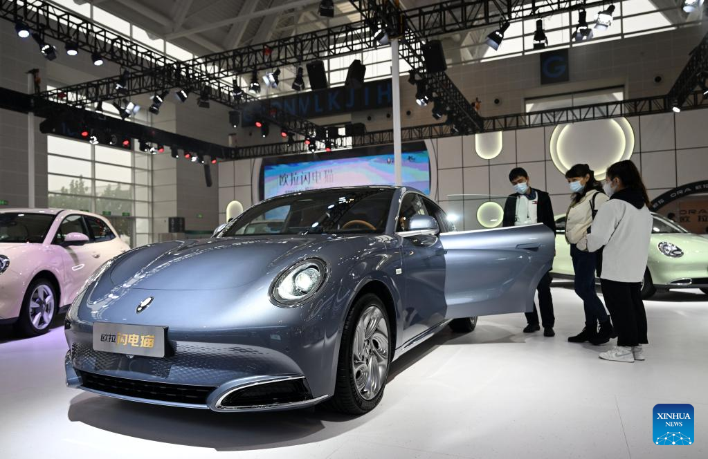 Visitors view a vehicle at the booth of ORA, a sub-brand of Chinese automaker Great Wall Motors during the China Motor Show (Tianjin) 2022 in north China's Tianjin, Nov. 10, 2022. (Xinhua/Zhao Zishuo)