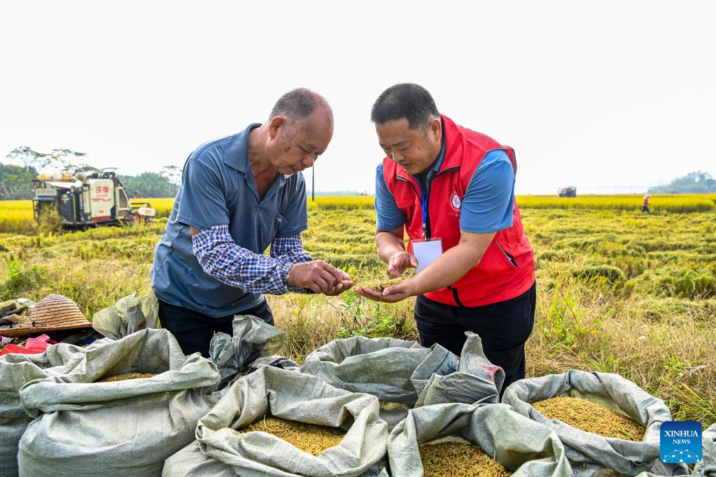 A technician (R) checks the quality of rice in Fengshan Village of Xingye County, south China's Guangxi Zhuang Autonomous Region, Nov. 10, 2022. (Xinhua/Cao Yiming)