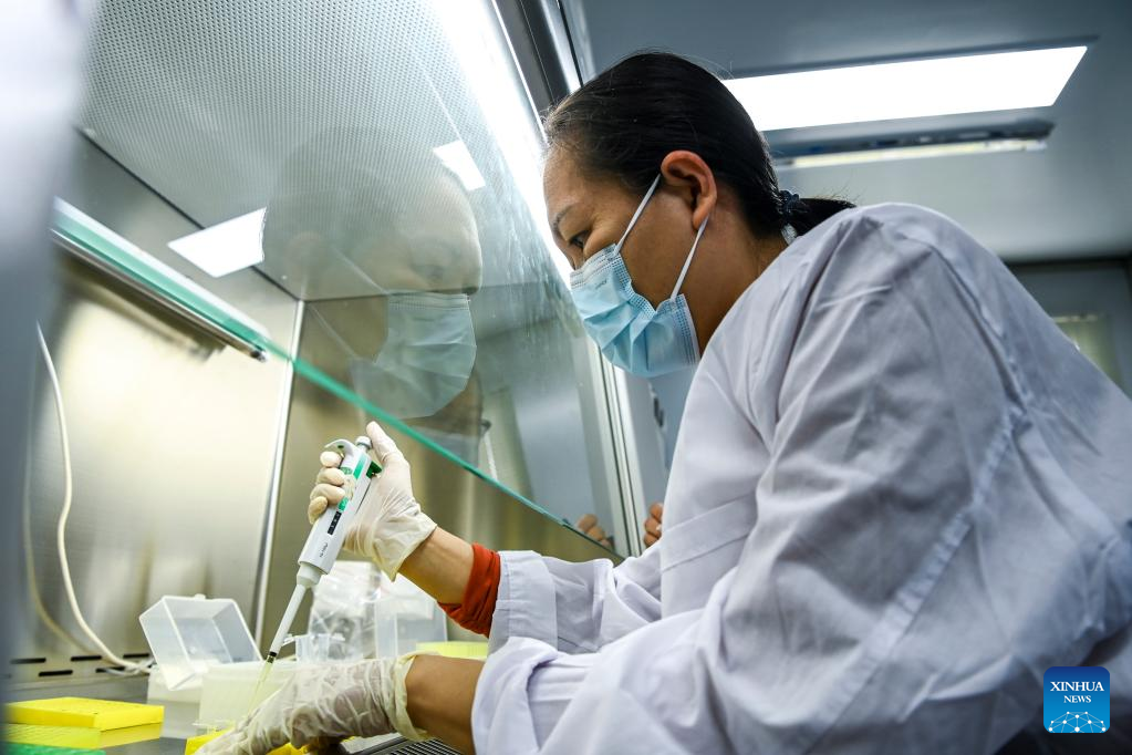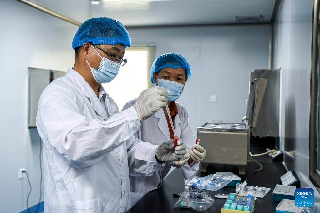 Technicians test poultry blood specimen at a laboratory in Xingye County, south China's Guangxi Zhuang Autonomous Region, Nov. 10, 2022. (Xinhua/Cao Yiming)