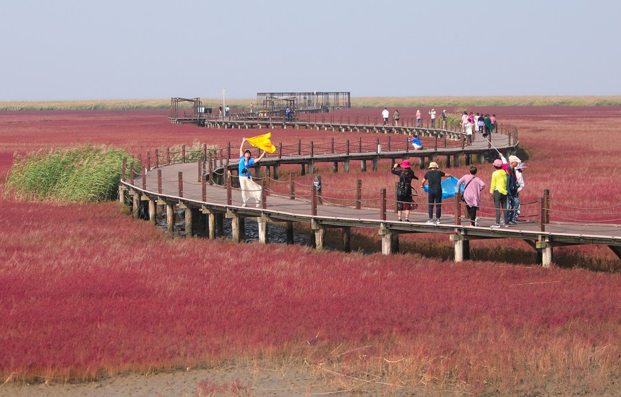 People enjoy the scenery of the Red Beach scenic area in Panjin, northeast China's Liaoning Province, Sept. 28, 2022. Various types of wetlands have been found in the Liaohe River Delta. The tidelands there are covered by the suaeda salsa, which turn red on the beach in autumn. (Xinhua/Wang Yijie)