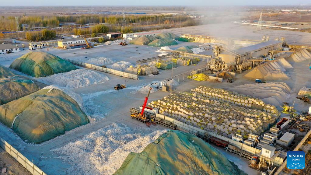 This photo taken on Nov. 11, 2022 shows the production site of a cotton company in Xayar County, northwest China's Xinjiang Uygur Autonomous Region. (Photo by Liu Yuzhu/Xinhua)