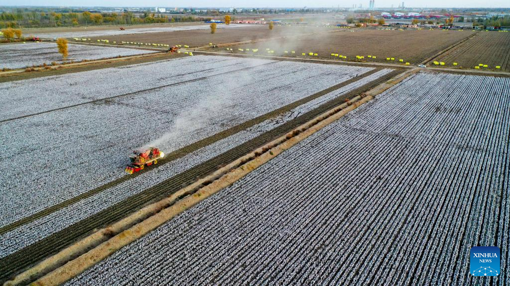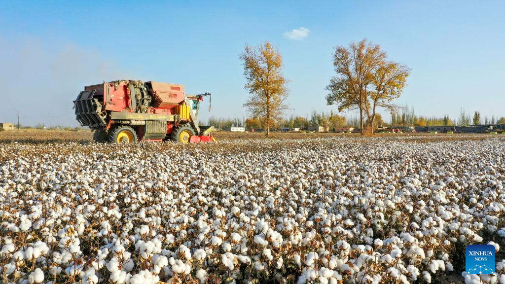 The cotton harvest is drawing to an end in Xayar County, northwest China's Xinjiang Uygur Autonomous Region, a premium-quality cotton production base of China. As of Friday, 1.706 million mu (about 113,733 hectares) of cotton has been harvested here.