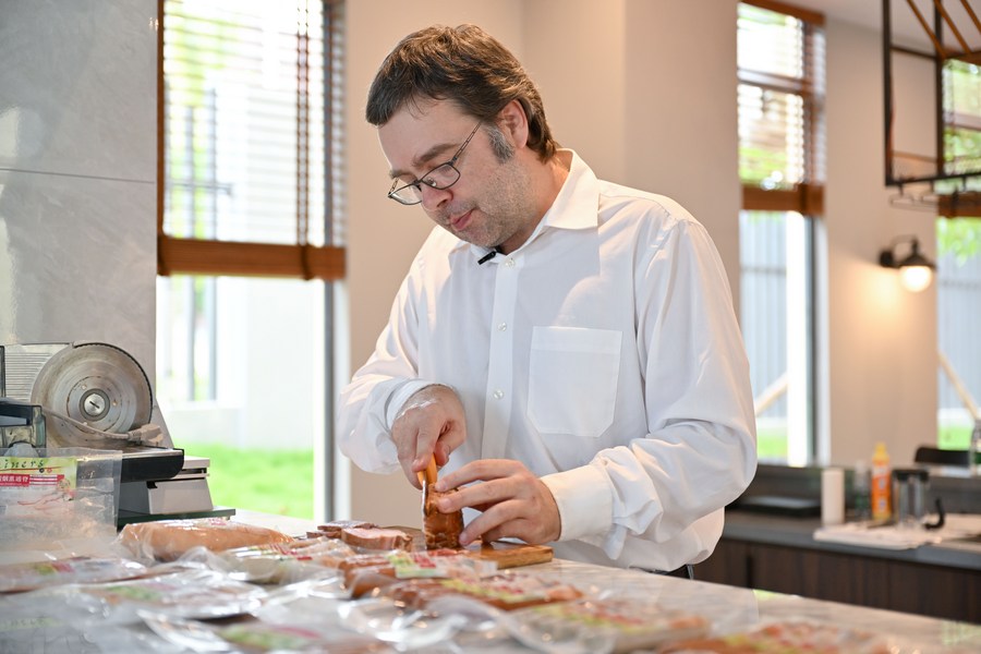 Kay Feske slices processed meat in his office building in Ding'an, south China's Hainan Province, Nov. 7, 2022. (Xinhua/Guo Cheng)