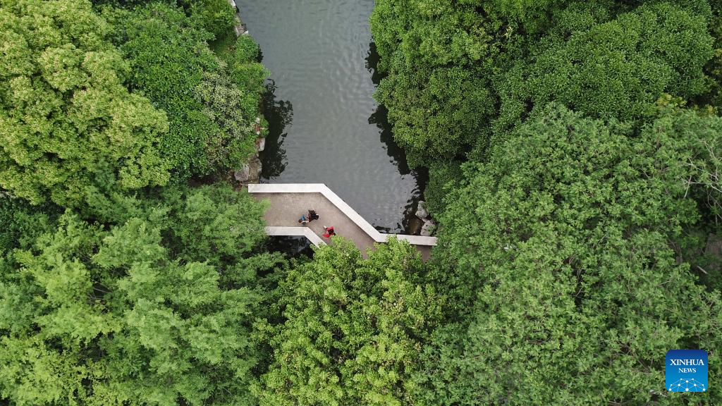 This aerial photo taken on May 5, 2021 shows citizens walking at Huancheng park in Hefei City, east China's Anhui Province. (Xinhua/Zhang Duan)