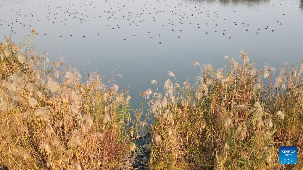 This aerial photo taken on Nov. 7, 2022 shows scenery of a wetland around the Chaohu Lake in Hefei City, east China's Anhui Province. (Xinhua/Zhang Duan)