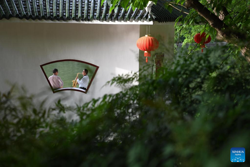 A citizen plays the instrument at Huancheng park in Hefei City, east China's Anhui Province, May 5, 2021. (Xinhua/Zhang Duan)