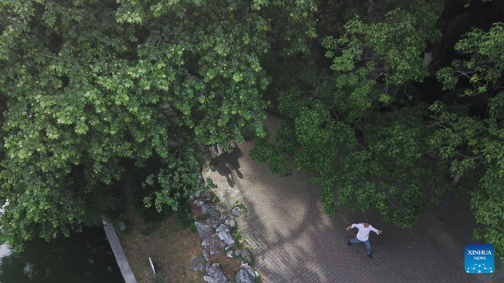 This aerial photo taken on May 5, 2021 shows a citizen exercising at Huancheng park in Hefei City, east China's Anhui Province. (Xinhua/Zhang Duan)