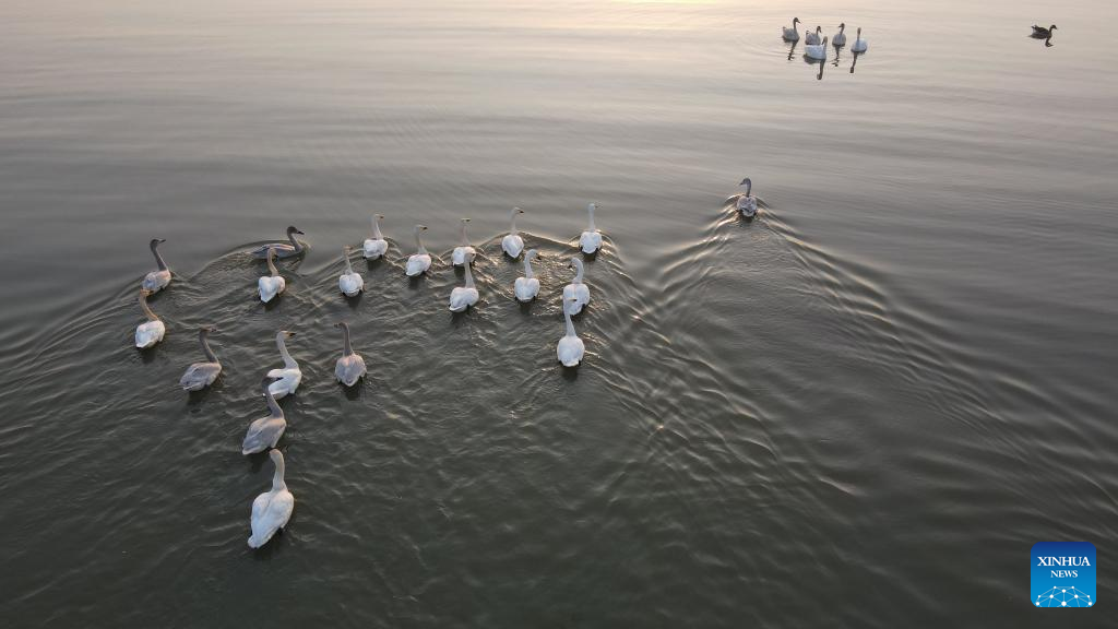 This aerial photo taken on Nov. 9, 2022 shows migrant birds on the Chaohu Lake in Hefei City, east China's Anhui Province. (Xinhua/Zhang Duan)