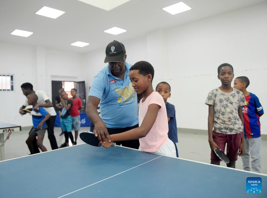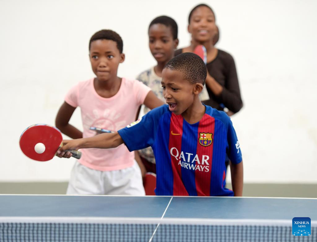 Kids practice table tennis at BNYC in Gaborone, Botswana's capital city, Nov, 8, 2022. (Photo by Tshekiso Tebalo/Xinhua)