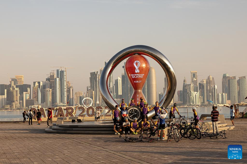 People take photos with a FIFA World Cup 2022 installation near the Doha Corniche in Doha, Qatar, on Nov. 11, 2022. (Xinhua/Xu Zijian)