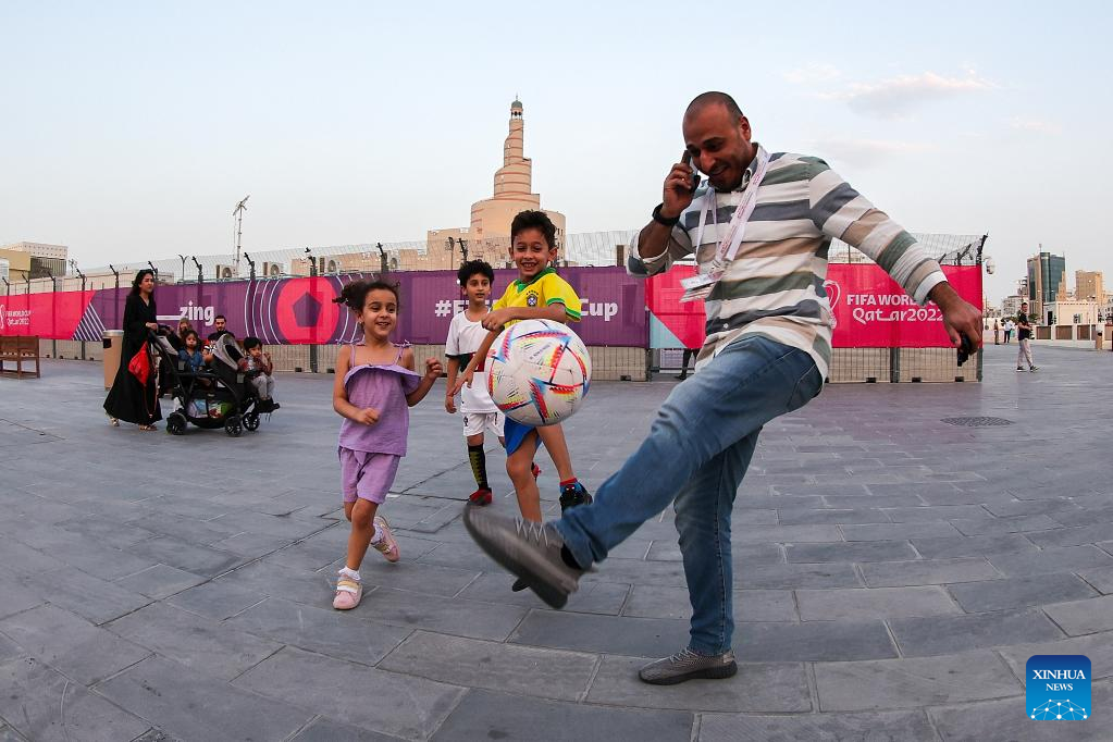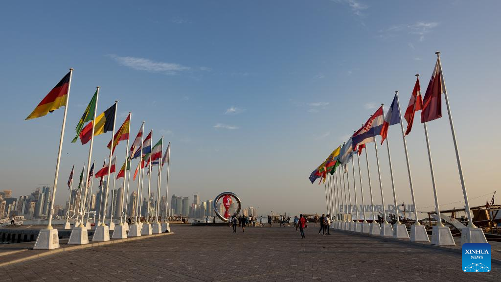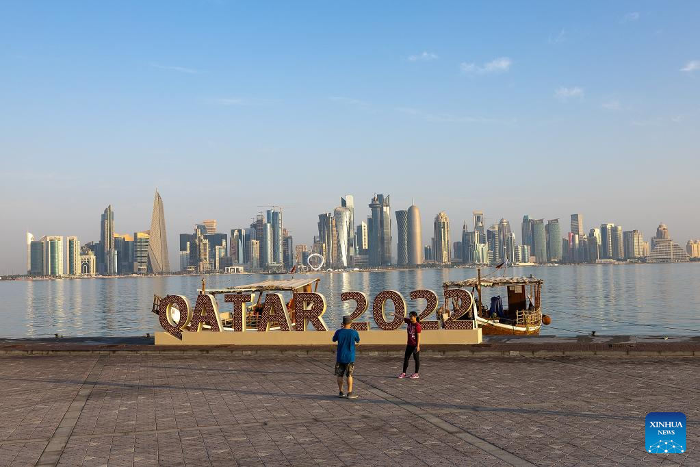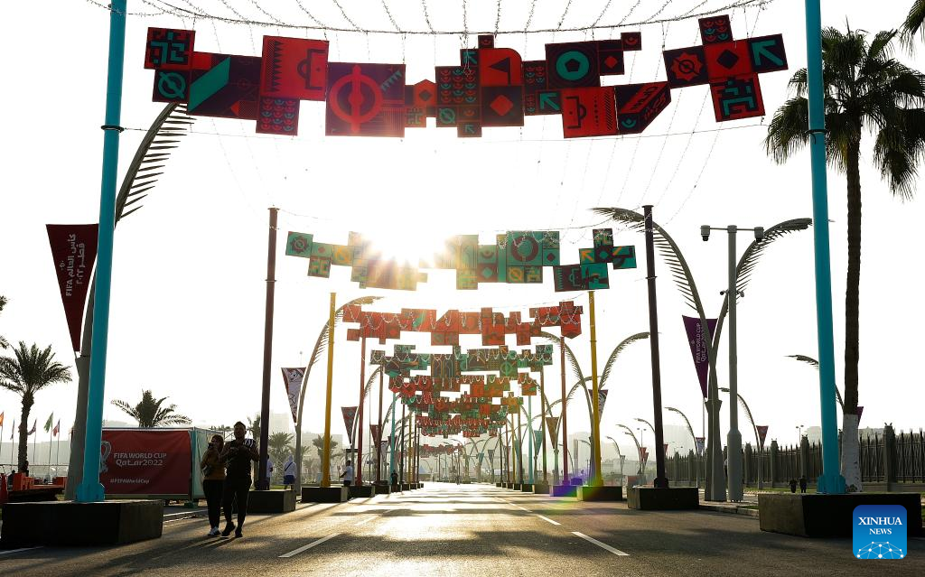 Pedestrians walk on the Doha Corniche with FIFA World Cup 2022 decorations in Doha, Qatar, on Nov. 11, 2022. (Xinhua/Xu Zijian)