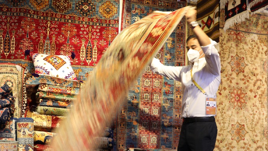 A man showcases a handmade carpet from Afghanistan. (People's Daily Online/Gu Haimin)