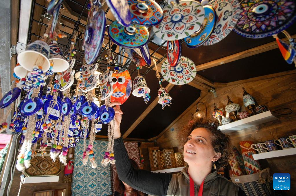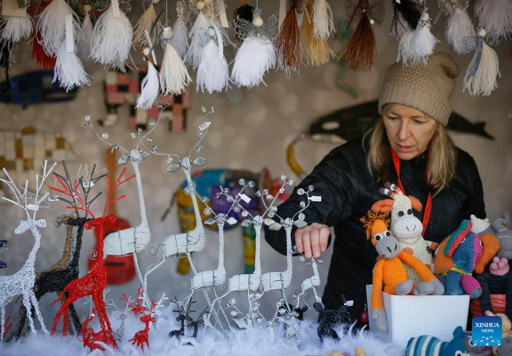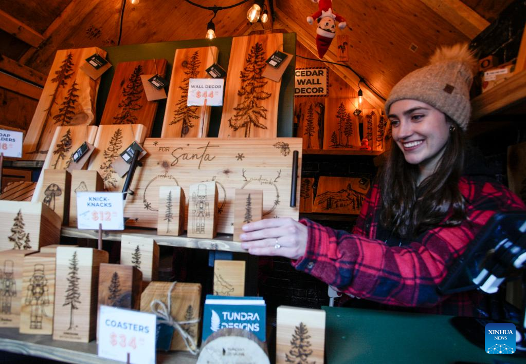 A store vendor displays some ornaments inside a hut at the Vancouver Christmas Market in Vancouver, British Columbia, Canada, on Nov. 14, 2022. (Photo by Liang Sen/Xinhua)