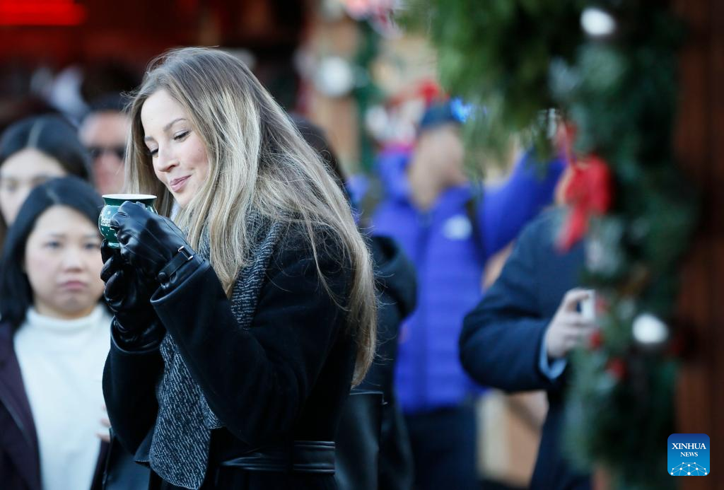 A visitor enjoys her cup of drink at the Vancouver Christmas Market in Vancouver, British Columbia, Canada, on Nov. 14, 2022. (Photo by Liang Sen/Xinhua)