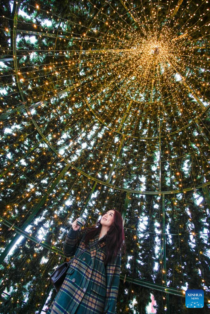 A woman looks at the light installation while visiting the Vancouver Christmas Market in Vancouver, British Columbia, Canada, on Nov. 14, 2022. (Photo by Liang Sen/Xinhua)