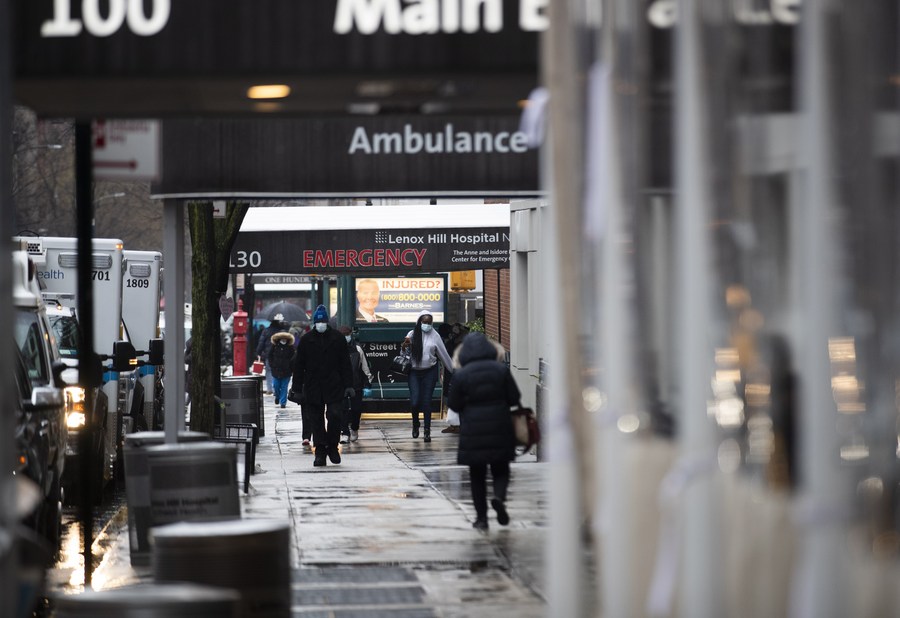 Pedestrians walk past the emergency entrance of a hospital in New York, the United States, Feb. 22, 2021. (Xinhua/Wang Ying)
