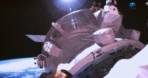 Later, the cargo craft conducted a fast automated rendezvous and docking with China's Tiangong space station combination. It was the first time that Chinese astronauts witnessed the arrival of a cargo craft in the country's space station.