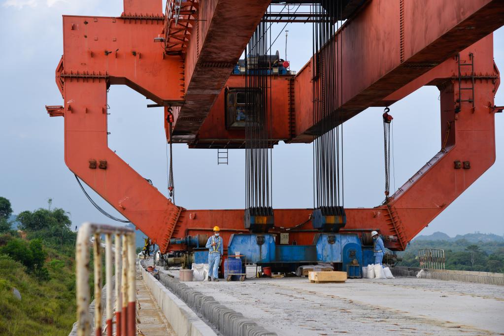 Workers are seen on the construction site of the erection of the last box girder on the Jakarta-Bandung High-Speed Railway in Purwakarta, Indonesia, Oct. 16, 2022.(Xinhua/Xu Qin)