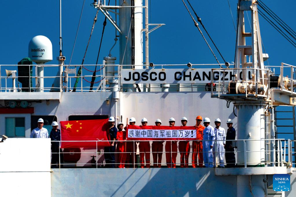 Crew members of a ship escorted by the 41st fleet of the Chinese People's Liberation Army Navy display a sign to express gratitude to the Chinese navy fleet on Aug. 5, 2022. A Chinese navy fleet returned to the port city of Zhoushan in east China's Zhejiang Province on Tuesday after completing its mission of escorting civilian vessels in the Gulf of Aden and in the waters off Somalia. (Photo by Xiang Liming/Xinhua)
