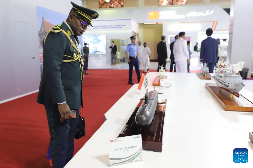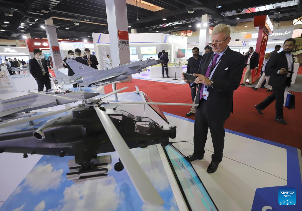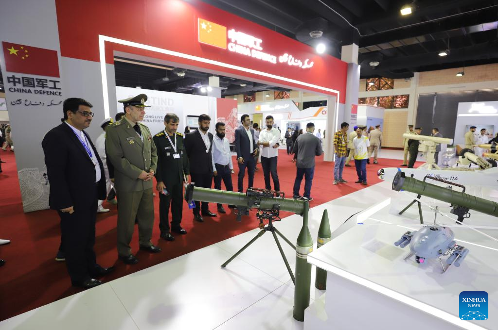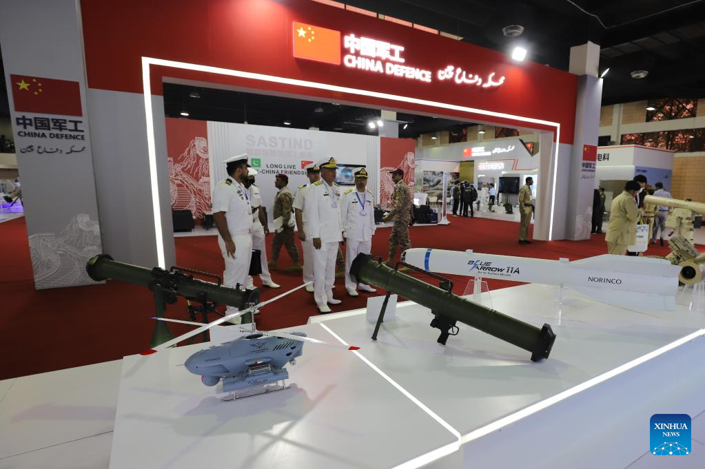 People visit the China Pavilion at the International Defense Exhibition and Seminar (IDEAS) in Karachi, Pakistan, on Nov. 15, 2022. The 11th edition of IDEAS kicked off on Tuesday at the Karachi Expo Center in Pakistan's southern port city of Karachi. (Xinhua/Jiang Chao)