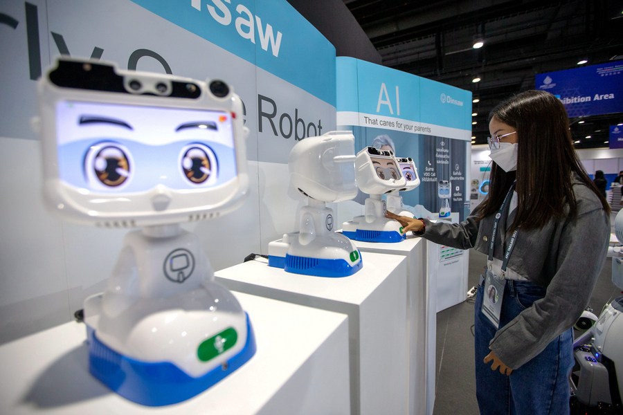 A staff member interacts with a robot at the media center of APEC 2022 in Bangkok, Thailand, Nov. 14, 2022. (Xinhua/Wang Teng)
