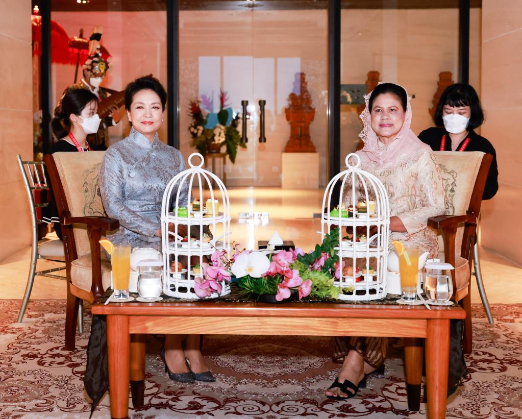 Peng Liyuan, wife of Chinese President Xi Jinping, tastes fragrant teas and chats with Indonesian First Lady Iriana Joko Widodo in Bali, Indonesia, Nov. 16, 2022. Peng met here on Wednesday afternoon with Iriana. (Xinhua/Ding Lin)