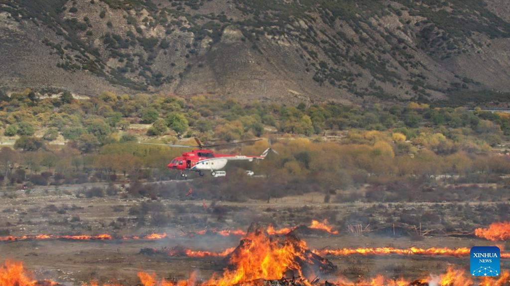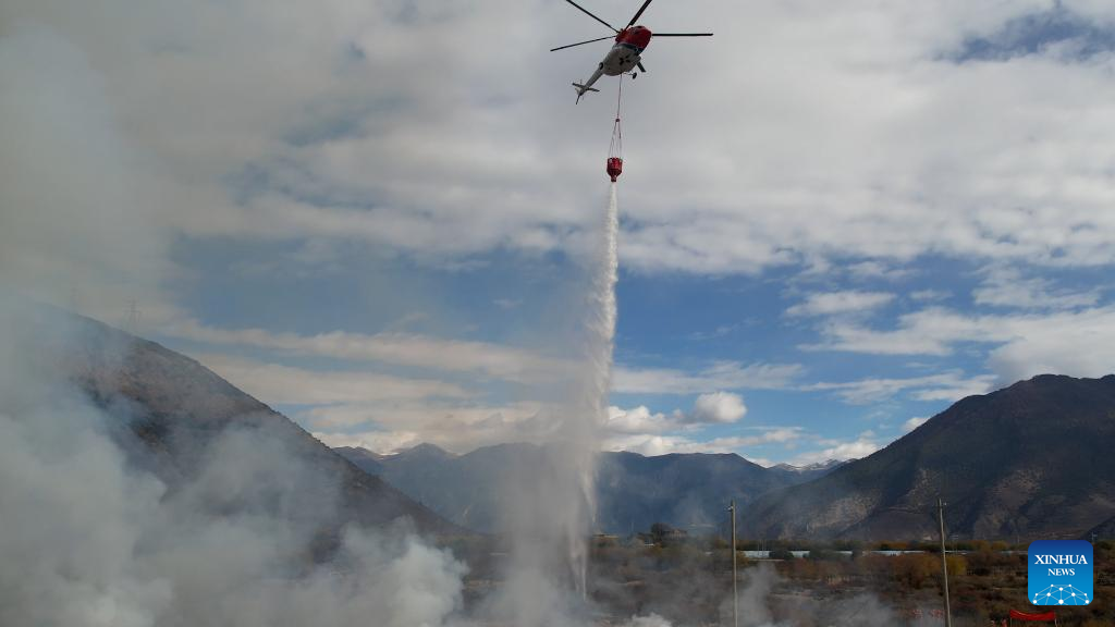 An airborne drill is conducted by Tibet's airborne rescue team for emergency response to train for firefighting in southwest China's Tibet Autonomous Region, Nov. 12, 2022. (Xinhua)