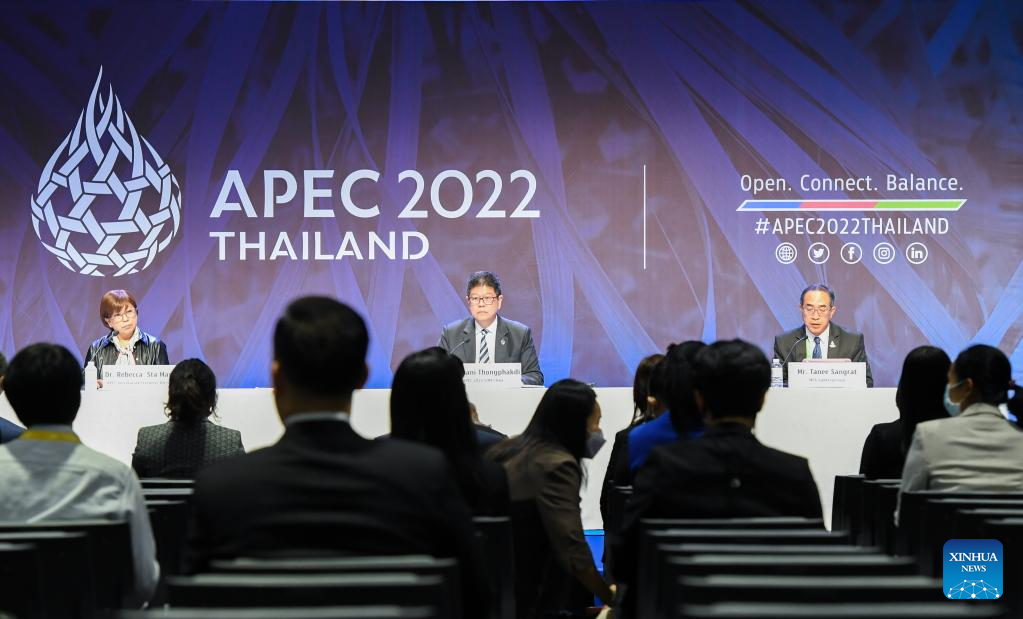 This photo taken on Nov. 16, 2022 shows a press conference after the Asia-Pacific Economic Cooperation (APEC) Senior Officials' Meeting in Bangkok, Thailand. (Xinhua/Guo Lei)