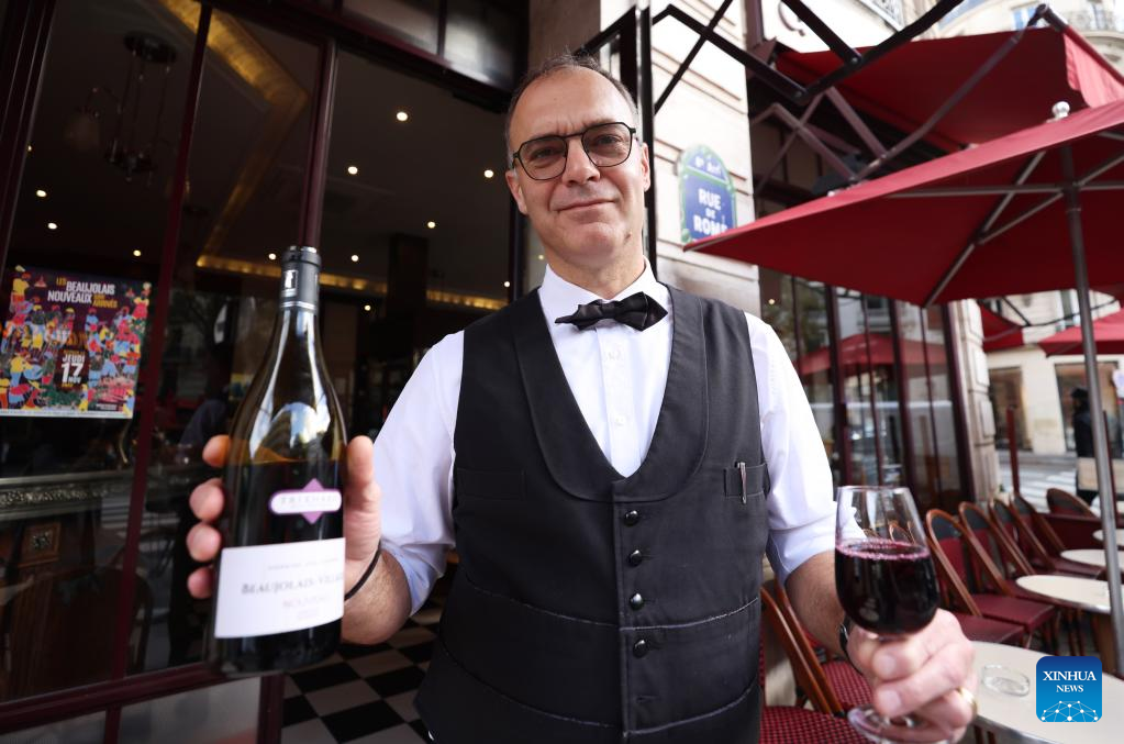 A waiter serves new Beaujolais Nouveau wine at a restaurant in Paris, France, Nov. 17, 2022. The new Beaujolais Nouveau, a well-known French wine, was released on Thursday. (Xinhua/Gao Jing)