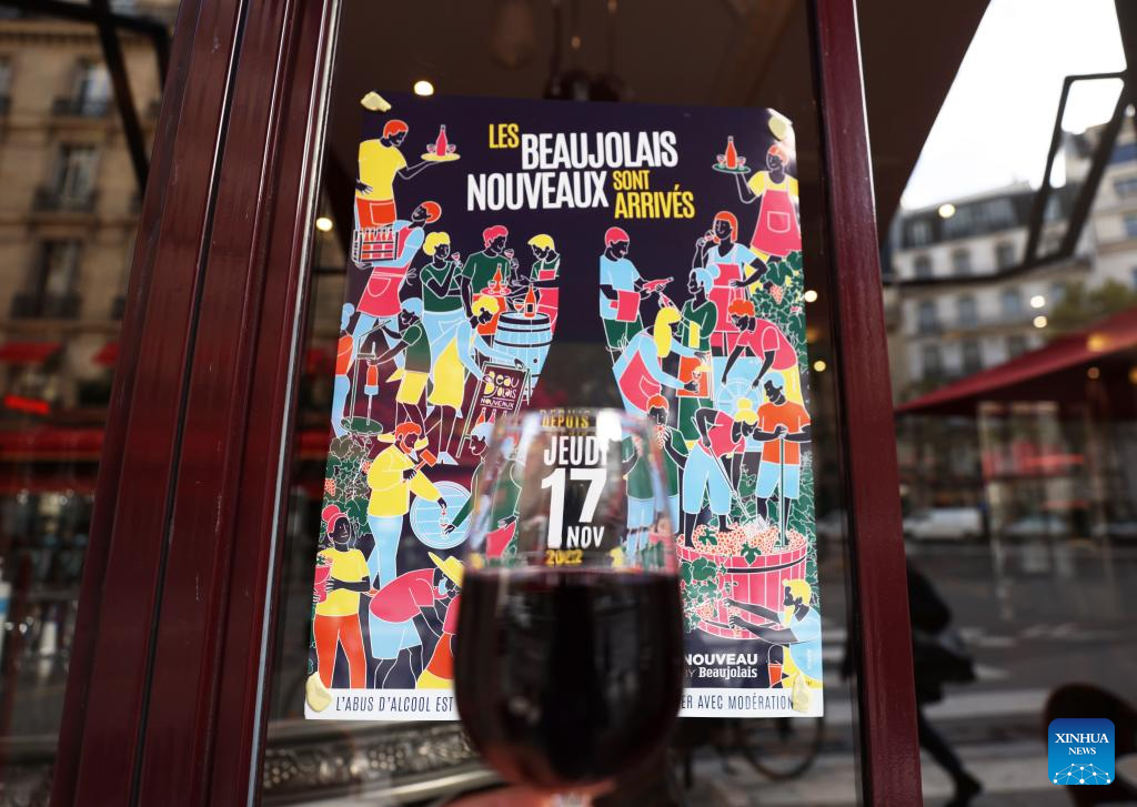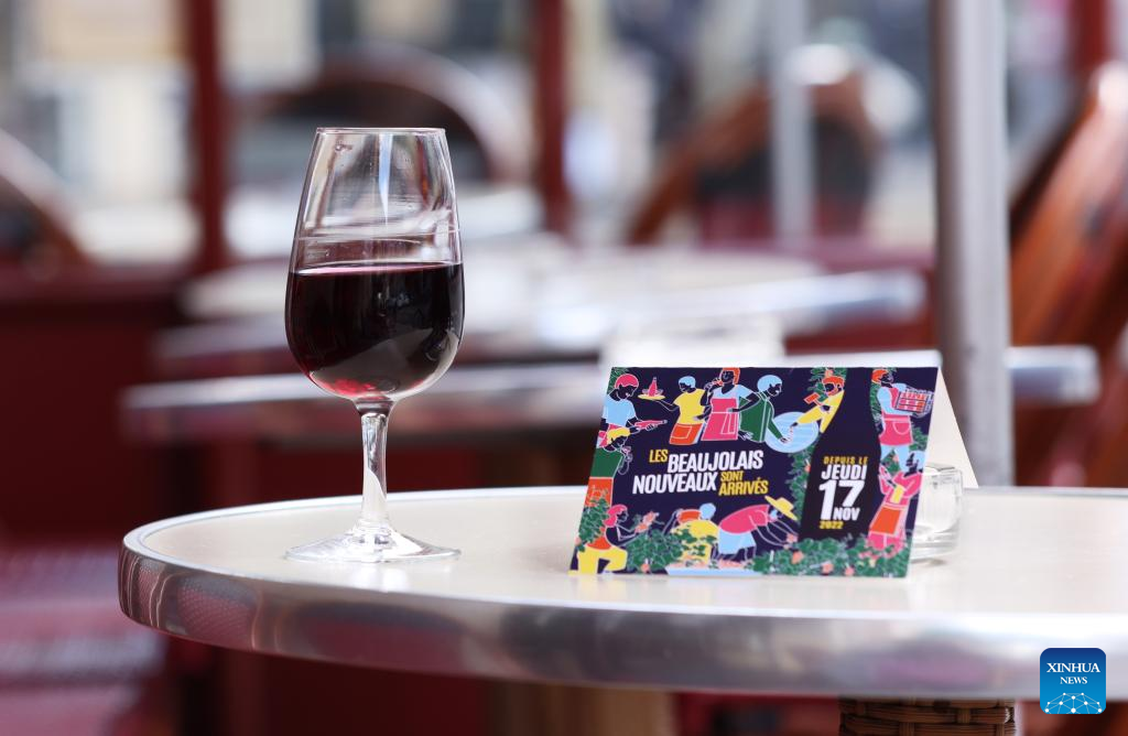 A glass of Beaujolais Nouveau wine is seen at a restaurant in Paris, France, Nov. 17, 2022. The new Beaujolais Nouveau, a well-known French wine, was released on Thursday. (Xinhua/Gao Jing)